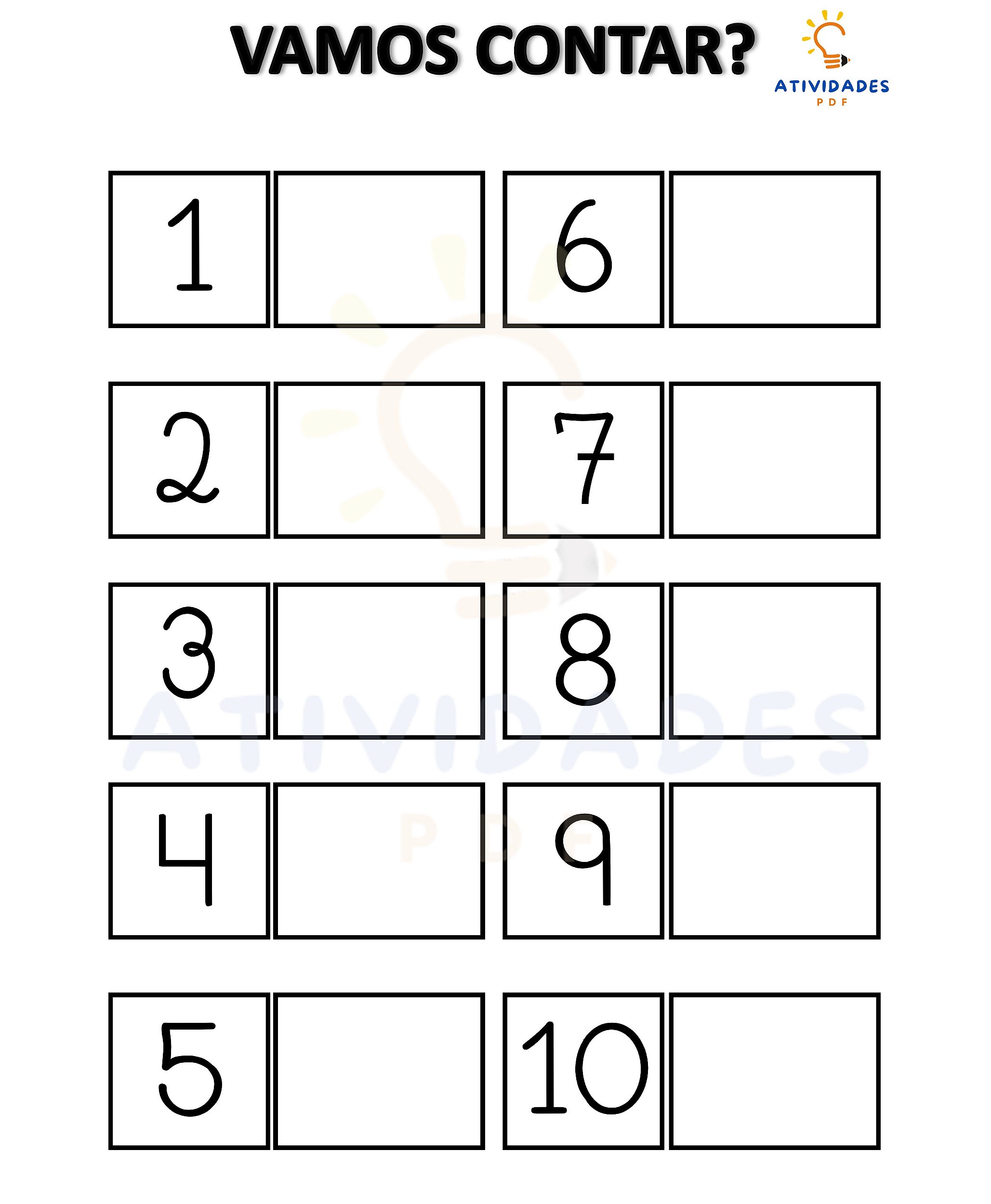 Atividade para aprender a contar/quantificar até 10. Arquivo com uma folha com os números de 1 a 10 e 10 fichas com imagens (de 1 até 10) para serem fixadas no local correto da folha, de acordo com a quantidade.