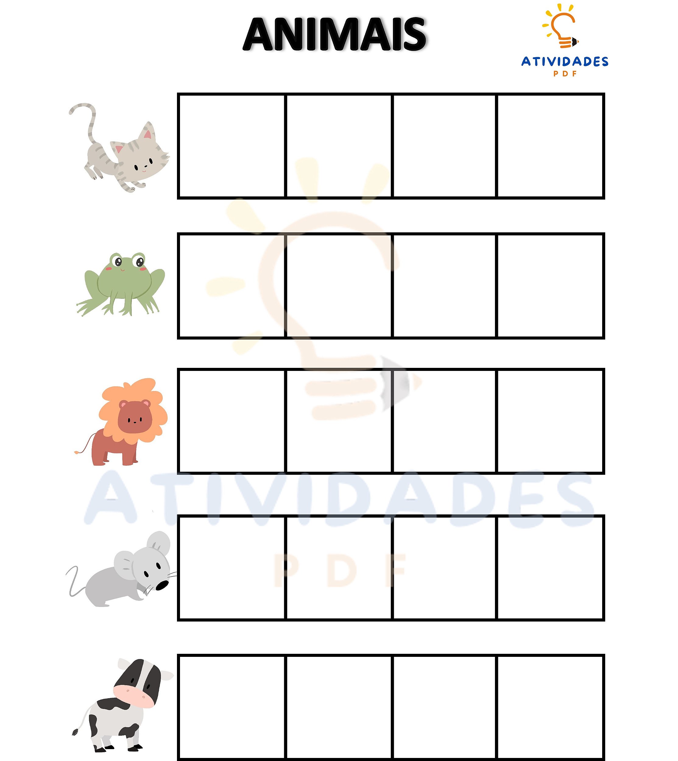 O arquivo contém uma folha principal com os espaços e as imagens dos animais e uma folha com letras para serem recortadas e coladas no local correto, formando o nome dos animais que constam nas imagens.