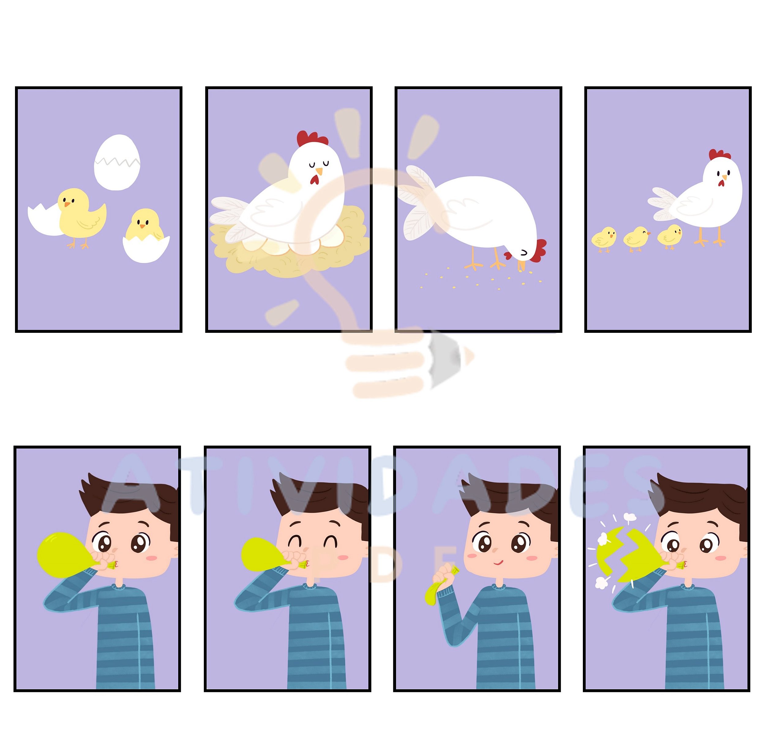 São 7 histórias com 4 imagens cada. O objetivo é que o aprendente identifique a sequência correta das cartas de acordo com a lógica, como nas imagens. Ao todo são 28 imagens.